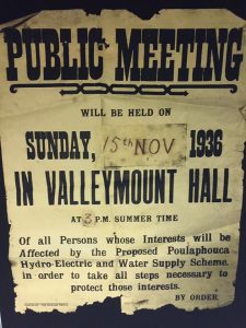 An ESB initiative by a relatively ‘young’ Fianna Fail government, it was Minister Sean Lemass who signed off on the final order in 1939 with up to 200 families having to relocate. For some, this was an emotive break to a homeland their families had lived for generations. Although the process originally started as far back as 1919, it took 20 years for the scheme to come to fruition. As one of the posters displayed here shows, there was serious public debate on the matter and sadly, many families really thought it would never happen.