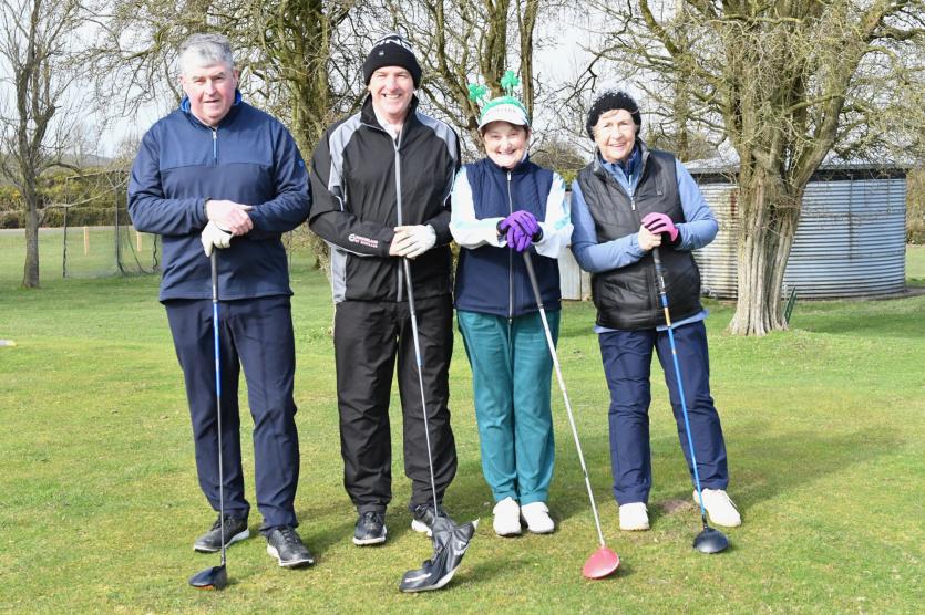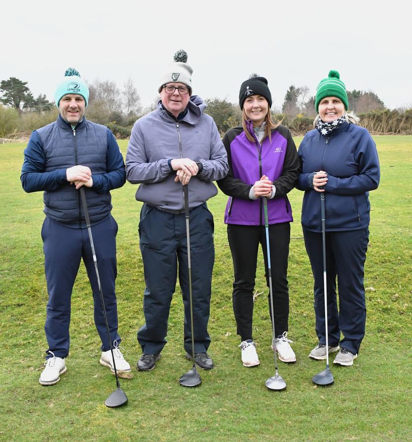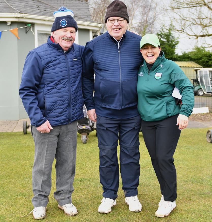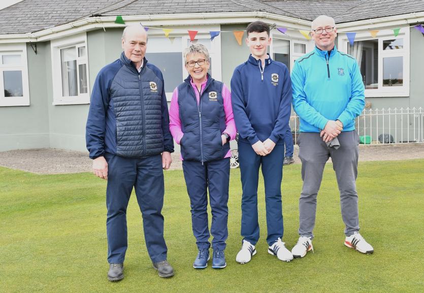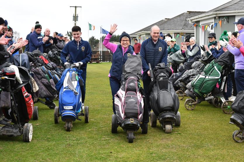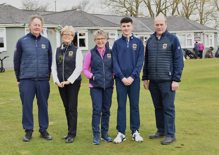Herbie Wilkins Chairperson, Ann Doyle president, Ladies Captain Joan Moran, Mens Captain Gerry Sully, Junior Captain Jamie Callan at the Cill Dara Golf Club Captain's drive-in in Little Curragh, Co.Kildare in slide one.