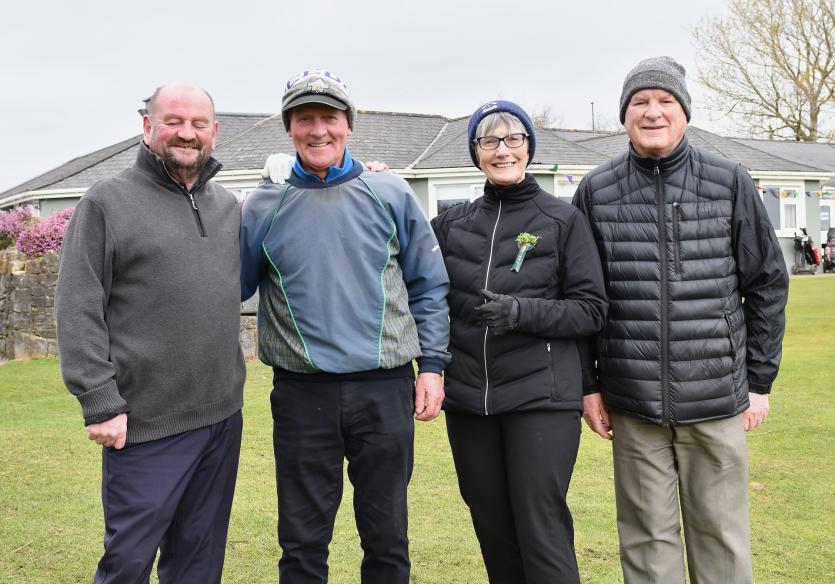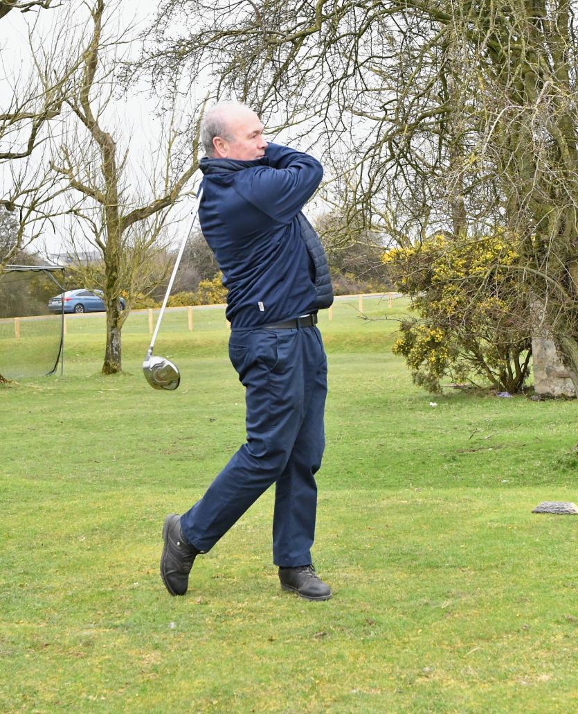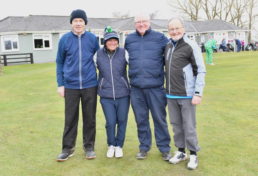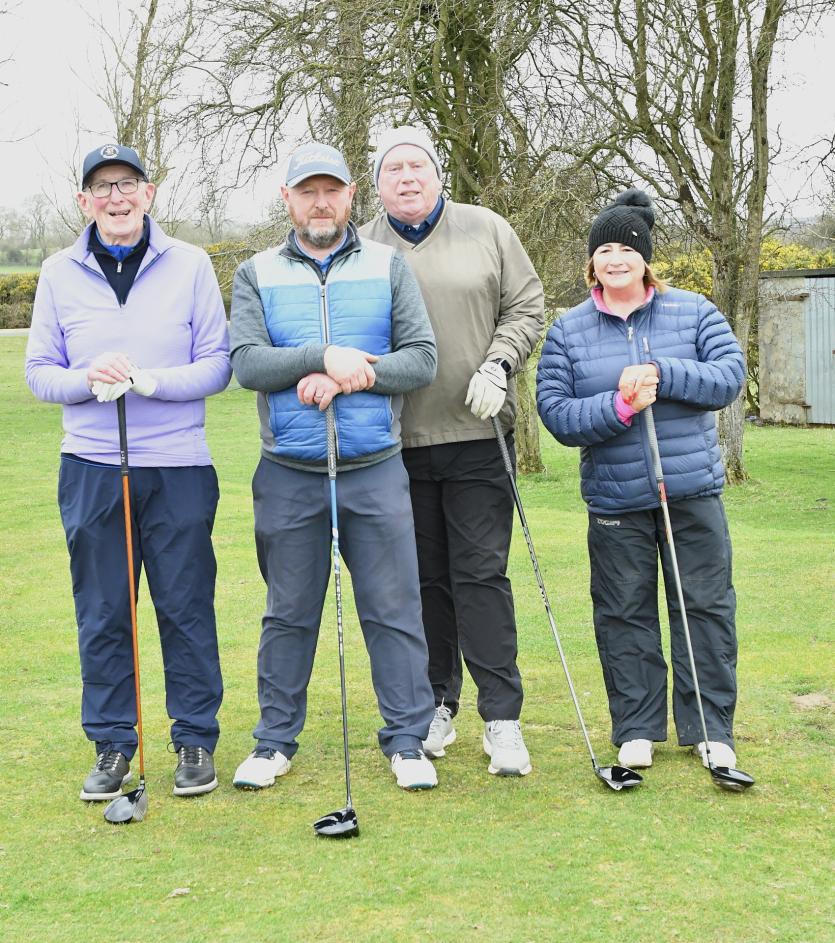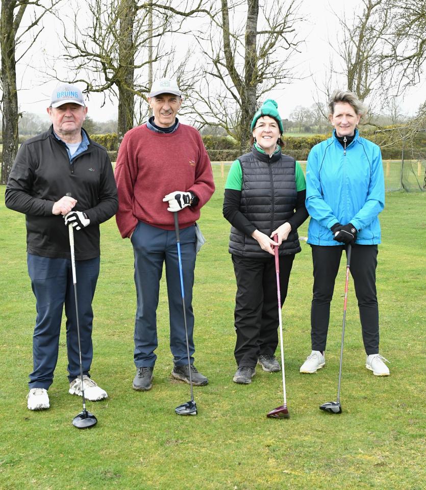 Herbie Wilkins Chairperson, Ann Doyle president, Ladies Captain Joan Moran, Mens Captain Gerry Sully, Junior Captain Jamie Callan at the Cill Dara Golf Club Captain's drive-in in Little Curragh, Co.Kildare in slide one.