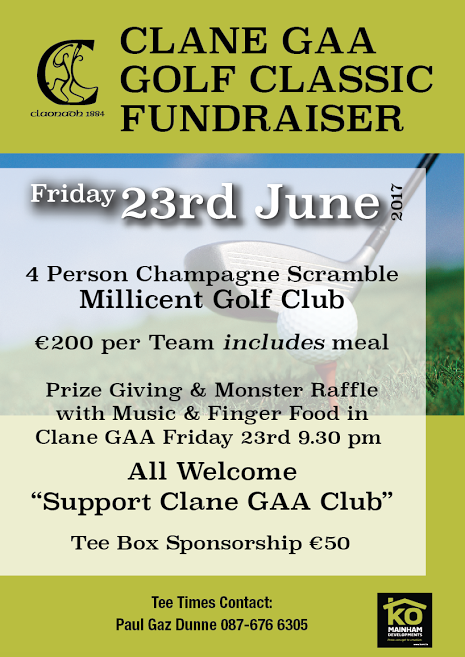 Clane GAA is holding a Golf Classic fundraiser later this month. The event takes place at Millicent Golf Club. There will be prize giving ceremony in Clane GAA on Friday June 23 as well as and a monster raffle with music and finger food.
