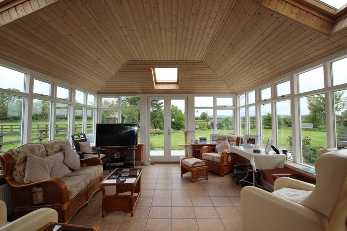 The spacious sunroom receives excellent sunlight all year round[/caption] Outside the property is approached via attractive piers with a spacious tree lined gravelled driveway with ample room for cars. The landscaped gardens are mainly in lawn and to the rear of the property there is an attractive stable block with 5 stables, a tack room, haybarn and detached garage. Meanwhile, the yard has a separate entrance and is situated conveniently to the stud-railed paddocks and the ands are all in grass and are surrounded by mature trees and hedgerows.
