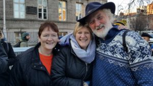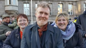 Last week saw Luke Kelly, renowned balladeer of The Dubliners honoured in his home ‘town’ with not one, but two sculptures unveiled to mark the 35th anniversary of his passing, one on each side of the River Liffey. John Coll’s work depicted a life-size bronze statue, showing the iconic figure seated and playing a banjo. This was erected at South King Street, with several Kildare musicians there to hear Uachtaráin na hEireann, Michael D Higgins do the official honours and make a passionate speech about Kelly’s huge influence on the Irish music stage. There for the unveiling in South King Street were Rob Chanders, renowned Athy musician, Ann Murphy Daly of Ballymore Eustace (the latter two are also founding members of Mor Cheol trad group) and Pat Keitley, also from South Kildare. President Higgins spoke fondly of Kelly, former member of The Dubliners whose distinctive ‘gravelly’ voice made him a household name in the ‘60s and ‘70s. Kelly died in 1984 but his ballad deliveries and unique way of singing continues to influence the music scene today. Mr Higgins, joined by his wife Sabina, stated Luke’s music was intrinsically linked to his growing up in Dublin, and reflected the struggles of the working class man: “a Dublin where children were ‘reared on songs and stories’, and music was an intrinsic part of daily life.” At the unveiling, there were several leading Irish musicians, amongst them John Sheehan, the sole remaining member of the Dubliners, along with Glen Hansard and Brendan Begleym and numerous other well known session musicians on the Irish trad scene. Afterwards, Ann, Rob and Pat were joined by fellow member, Don Duggan of Mor Cheol at O’Donoghue’s renowned Irish pub in Merrion Row where they hosted a session for three hours! “This was magic!” said Ann “They loved us and we loved performing in a venue which the Dubliners and Luke Kelly graced frequently, along with our own Christy Moore and many other famous Irish musicians. What a great day out we had!” The Kildare musicians were supported by Pauline Burke, nee Lynham who despite being married to a Wicklow man, and raising a family on the Kildare-Wicklow border, reminded us she is, and always will be a Dub, and was there to see one of Dublin’s most famous characters, Luke Kelly, honoured! [caption id="attachment_266878" align="alignnone" width="232"] Rob Chanders from Athy with John Sheehan of the Dubliners[/caption] [caption id="attachment_266877" align="alignnone" width="300"] Pauline and Ann with well known musician Brendan Begley[/caption] [caption id="attachment_266876" align="alignnone" width="300"] Pauline and Ann with musician Glen Hansard[/caption] [caption id="attachment_266875" align="alignnone" width="300"] Pauline Lynham of Ballymore Eustace and Hollywood Parish, but always a Dub with fellow Dub, John Sheehan at the unveiling[/caption] [caption id="attachment_266874" align="alignnone" width="225"] A sculpture by John Coll depicting one of Dublin's most famous sons, the late Luke Kelly of the Dubliners[/caption] A second sculpture, a marble portrait head of the musician, was created by award-winning portrait artist Vera Klute, a winning design selected from a competition run by former Lord Mayor of Dublin, Christy Burke. Feature photo shows Ann Murphy Daly, Kildare musician (accordian, guitar and vocals) with John Sheehan of the Dubliners.
