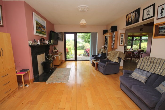 Initially constructed in the 1970, the property has been extended over the years and boasts spacious accommodation set amid private mature landscaped gardens bordered by a variety of trees and shrubs. Outside the property is approached by a recessed entrance via a sweeping tree-lined tarmacadam avenue with paddocks on both sides, a double garage with a workshop, fuel store, boiler house, mains water, oil fired central heating, PVC fascias and soffits. The property benefits from 12 acres of quality land which is perfect for grazing horses and includes proximity to the River Liffey.