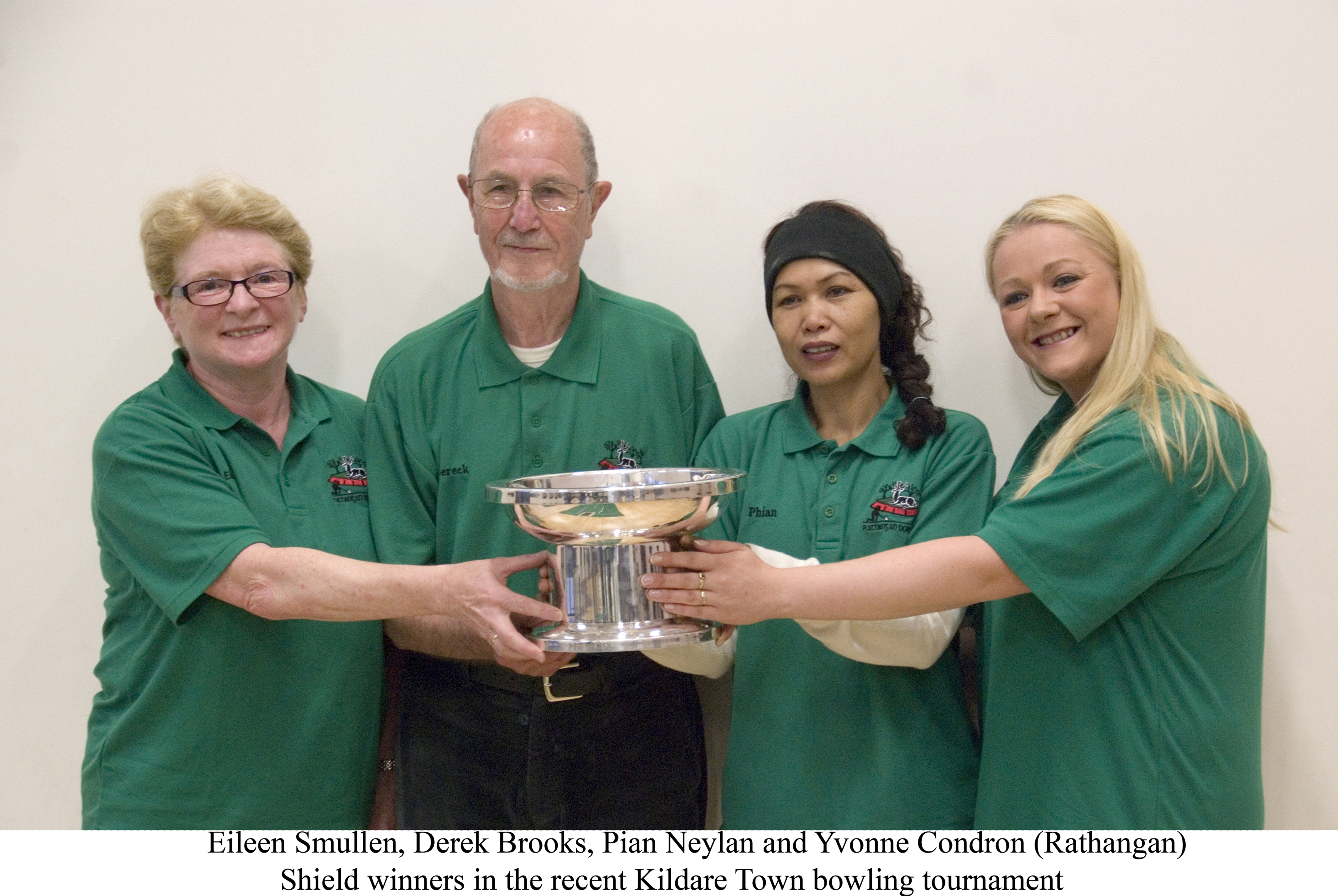 Rathangan: Yvonne Condron, Derek Brooks, Eileen Smullen and Pian Neylan. Rathcoffey: Eamonn Cunningham, Gerry McCann, Myra Gavin and Noel Byrne. The Kildare Town Bowling Club wish to express their thanks to all the clubs that participated and the many spectators who turned up each night to watch the games. To all the volunteers for their dedicated work in setting up the venue each night and to the catering staff who worked tirelessly every night supplying the refreshments. Last but not least, a special thanks to Des McWey for sponsoring the tournament once again.