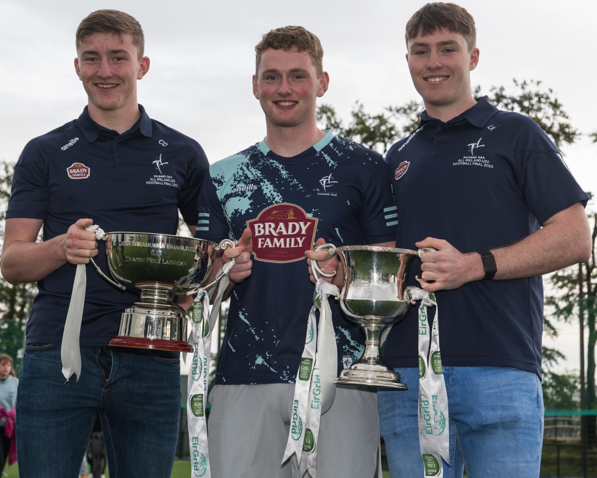 Colm Dalton, Sallins and Kildare U20’s with the Leinster Trophy, James McGrath (Athy) Kildare U20’s Player of the Year; and Luke Killian, Sallins and Kildare with the All Ireland U20’s Trophy.
