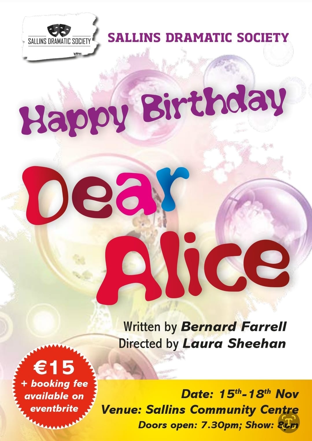 Written by award winning playwright Bernard Farrell, Happy Birthday Dear Alice is a dark comedy about the efforts of a dysfunctional family to commit their ageing, gentle, yet resilient mother to the uncertain fate of a nursing home. It promises chaos, farce, twists and a belly full of laughs when it goes on stage from the 15th to the 18th of November in Sallins Community Centre.