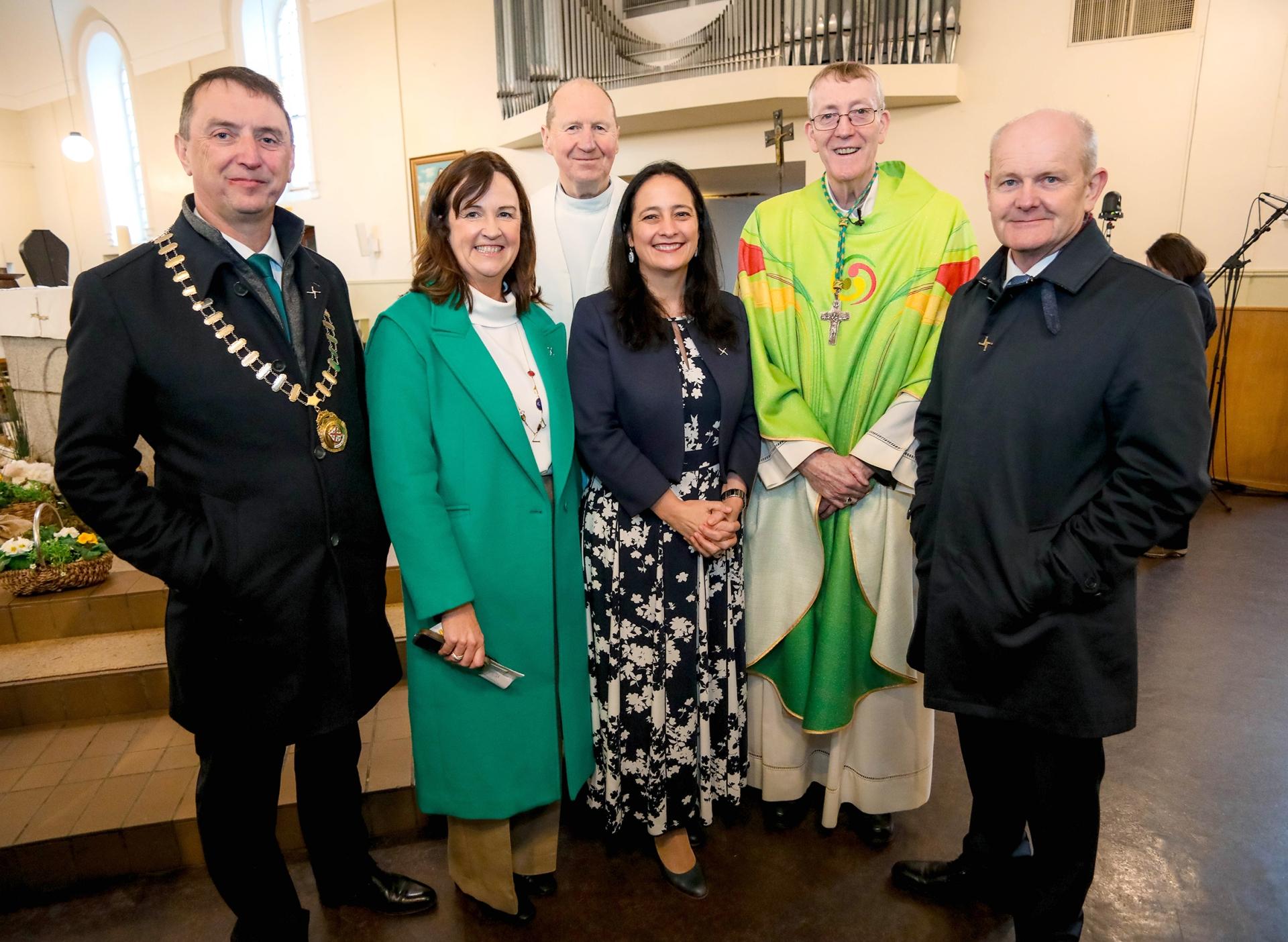 Caothairleach Cllr Daragh Fitzpatrick, Áine Mangan (CEO INTO Kildare), Fr Andy Leahy (PP Kildare Town), Minister for Tourism, Culture, Arts, Gaeltacht, Sport and Media, Catherine Martin, Bishop Denis Nulty and David Money (Chairman INTO Kildare) at Kildare Parish Church