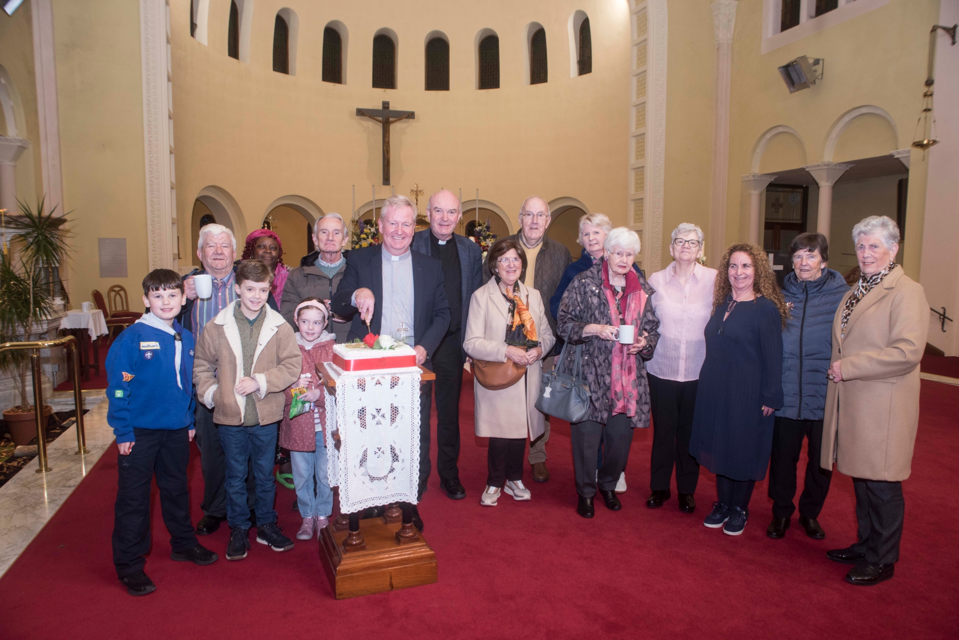 Bishop Paul Dempsey, Fr Liam Rigney PP, cutting the 60th Celebration Cake surrounded by some members of the congregation