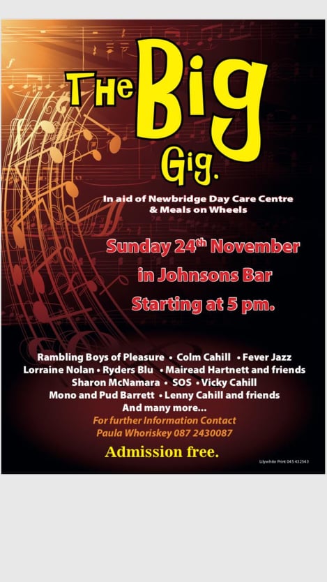 “The Big Gig will be a great night of live music, commencing from 5pm at Johnson's Bar, Newbridge, on Sunday 24 November. All welcome”.