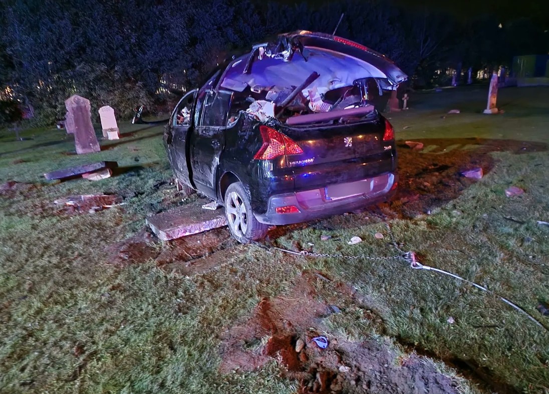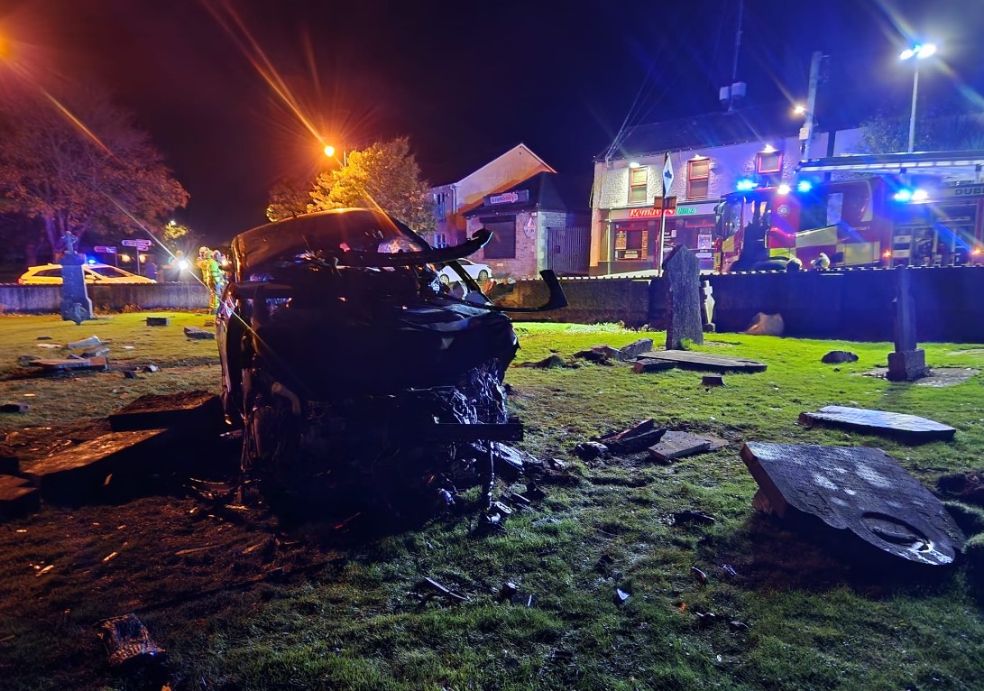 The car at the scene with damaged headstones visible / Photo: Dublin Fire Brigade