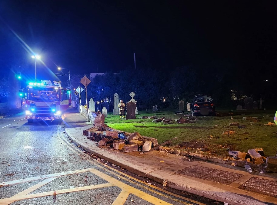 This was the incredible scene when a car lost control and drove through the wall of a cemetery in north Dublin.