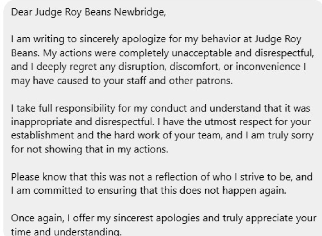 The offending party's apology. Photo credit: Judge Roy Beans via Instagram