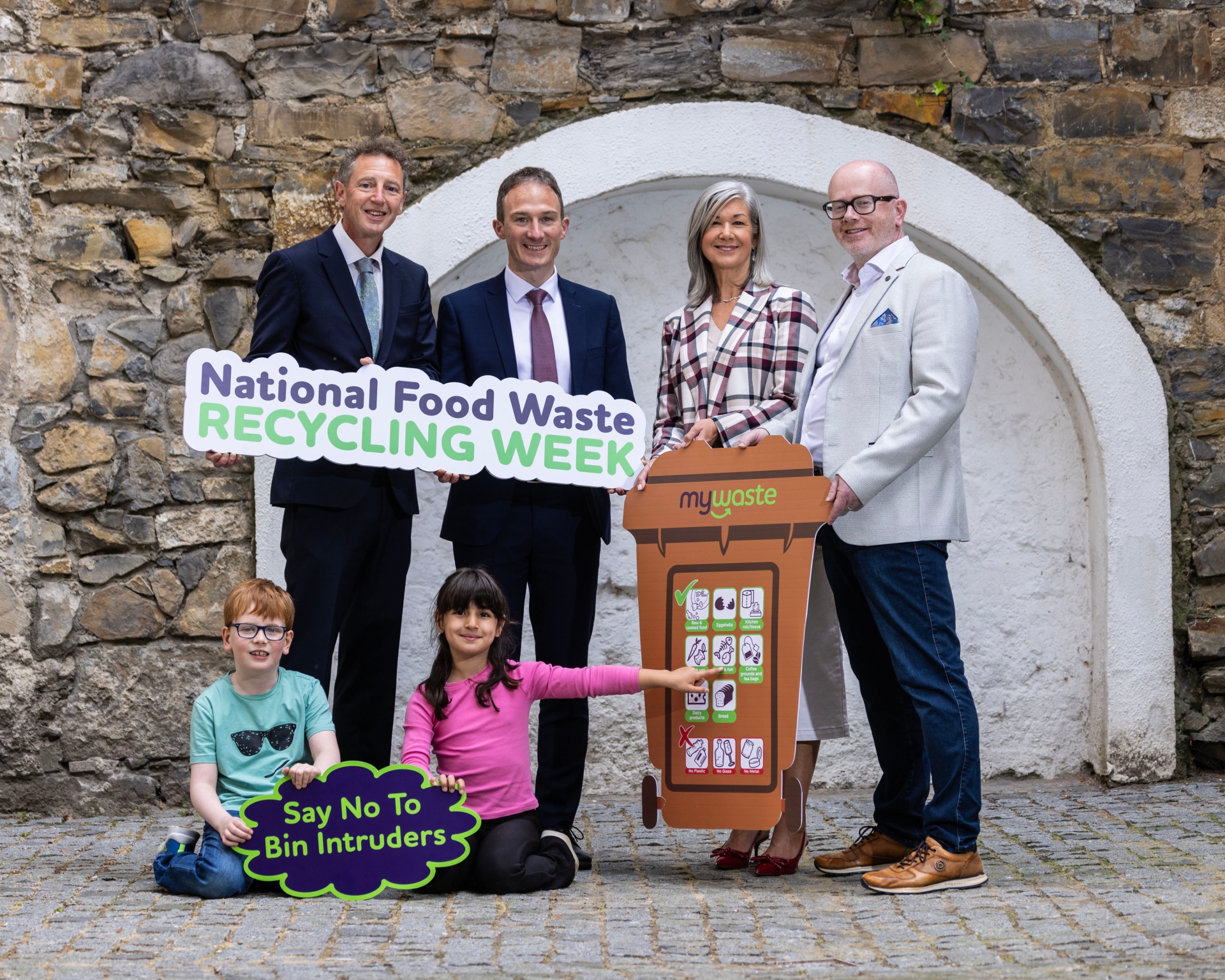 Rachel Hughes and James Lynskey (both aged 7, from Dublin) show off some common 'Brown Bin Intruders' — items that don’t belong in your brown bin — as Minister of State at the Department of the Environment, Climate and Communications with responsibility for Circular Economy, Alan Dillon launches National Food Waste Recycling Week campaign. Photograph by Fintan Clarke, Creative Coalesce. Photograph supplied by Su Pal of Wilson Hartnell.