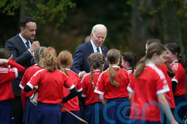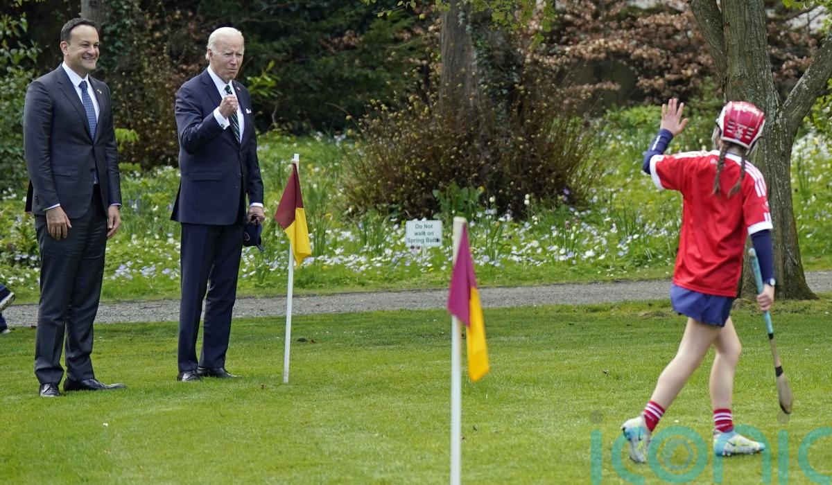 Mr Biden stood with Taoiseach Leo Varadkar and watched girls from St Brigid’s GAA Club play camogie at Farmleigh House in sunny Dublin on Thursday.