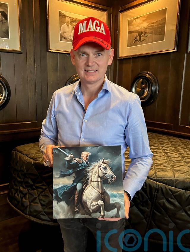Tadhg O’Shaughnessy and his partner Indu wore Trump caps, carried an American flag and also brought a specially-made portrait of the president riding a horse which they hoped to give to him.
