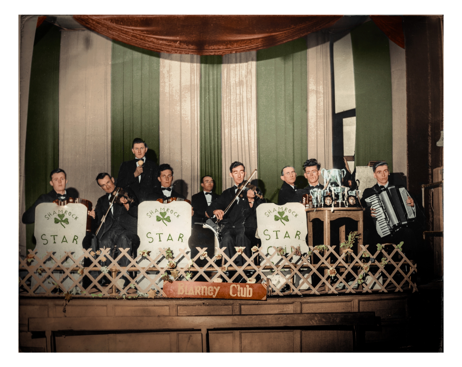 The main line up was: Christy on the accordion, fiddle and saxophone; Dinny, Ducks, Mick Lenehan and Paddy Dowling on accordion, Willie Aungier on fiddle, Jimmy (Goosey) Farrell and Dick Lenehan on drums, Jack O’Brien and Tommy Lube on piano, and Peter Gordon/Nessa O’Brien provided vocals.