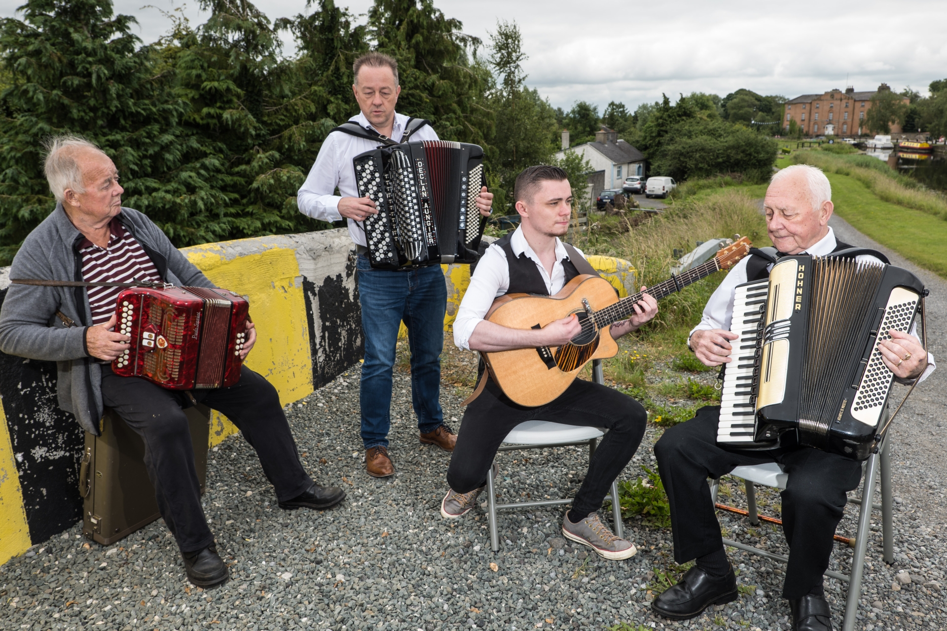 Paddy ’Ducks’ Moran (left) and Dinny Moran (right), members of the original Shamrock Star Céilí Band, are joined by Declan Aungier and Dinny’s grandson Zak Moran, for a tune in Robertstown on Thursday afternoon at the CD presentation of the Shamrock Star Céilí Band. Photos: Tony Keane.