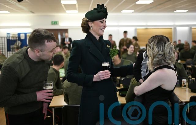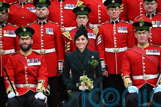 Dressed in green, Kate wore a shamrock as she met service personnel.
