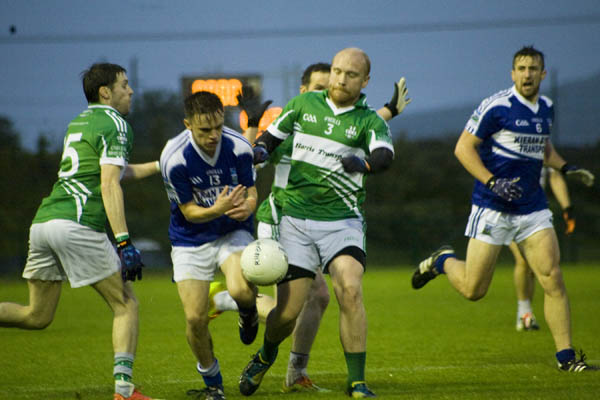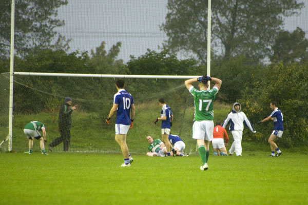 Castlemitchell's John O'Connor and Rheban's James Lawlor compete for possession. Photos by Anthony Daly.[/caption] They were silky in their build up play in the opening exchanges, Brandon Shaw’s opening point of the game a perfect example of attacking football at its best as he sent Rheban into the lead. This was quickly followed up by a superb goal from Conor Germaine as he unleashed a bullet into the top corner following a sweeping Rheban move. That was as good as it got for them however, as they played the remainder of the half without ever threatening their opponents goal again. Castlemitchell must be given credit too, they adapted to the conditions much better. They were quick in possession and always managed to find a man in space to find a route to goal. They kicked six point in a row before half-time, started by a fantastic left footed effort from the left wing by Tadhg Fennin, before goalkeeper Michael Lawless pointed a massive long range free. Man of the match Joe Maher then kicked a pair of close range scores and Castlemitchell were motoring. A free apiece from Maher and Lawless gave them a two point cushion at the interval, 0-6 to 1-1. https://www.youtube.com/watch?v=VWgnMQrX1dk&feature=youtu.be The second half was almost a mirror image of the first, with Rheban consistently losing possession when trying to move out of defence and Castlemitchell were more than happy to punish them. Emmet Hyland and Maher kicked them further into the lead, before Rheban’s marauding corner-back Kealan McConville finally lifted the siege with a point for the blues. It was soon game over though, as Maher was at the end of a fine team move and he fired the ball to the net from close range to leave the result in little doubt. That score came nine minutes into the second half, and unbelievably, it was the last score of the game. It teetered out with a whimper, Castlemitchell more than happy to run down the clock as the game wore on and Rheban just unable to find any extra gear to mount a comeback. [caption id="attachment_43969" align="alignnone" width="600"]