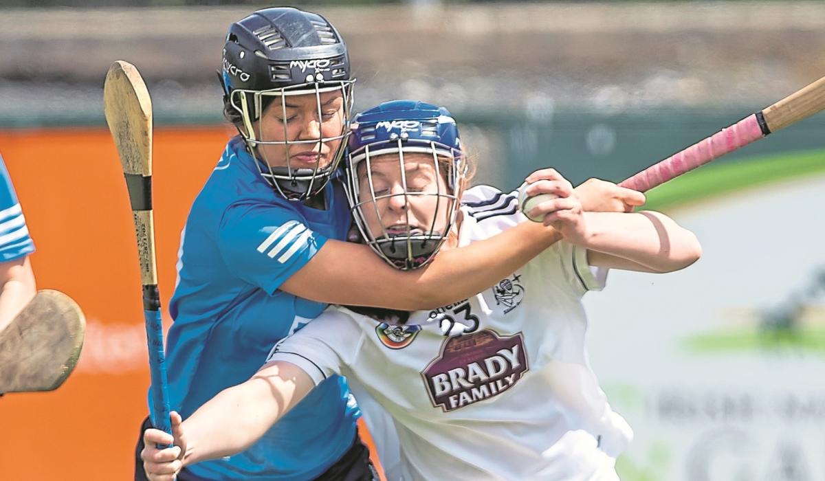 Kildare Kelly Perkins gets caught up in the challenge of Dublin Sinead O'Donoghue during the National Hurling League Division 2 game. Picture: Sean Brilly