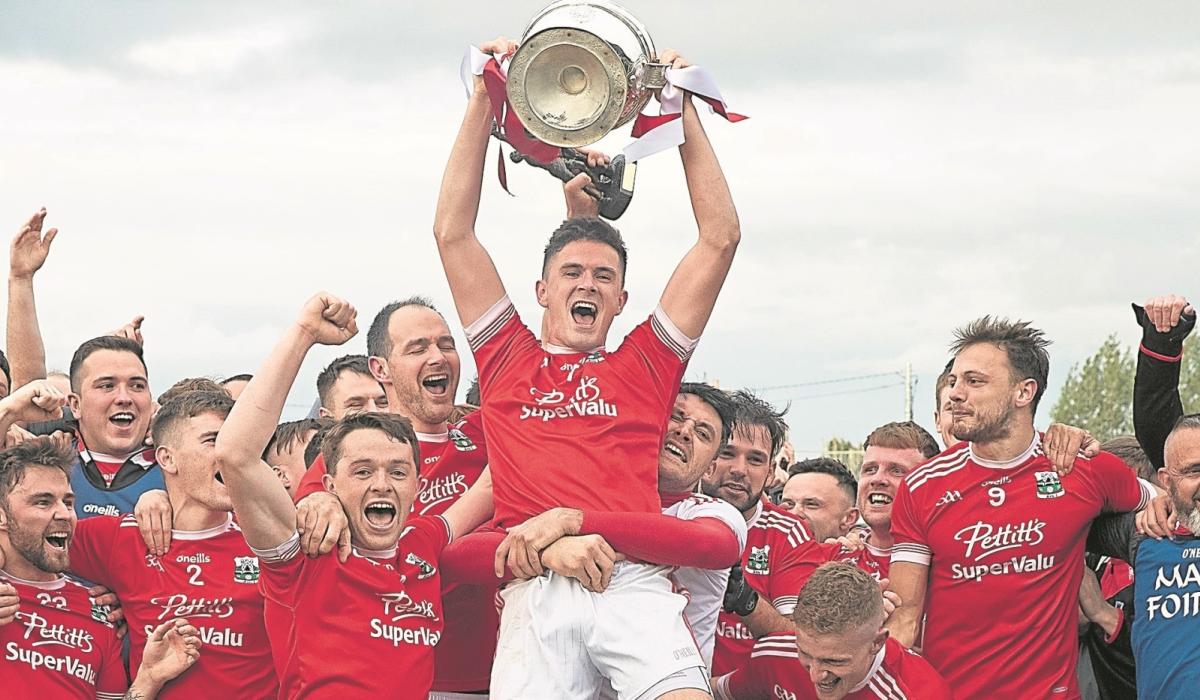 Athy Captain David Hyland is lifted high by his team mates at the Dermot Burke Cup presentation 2020