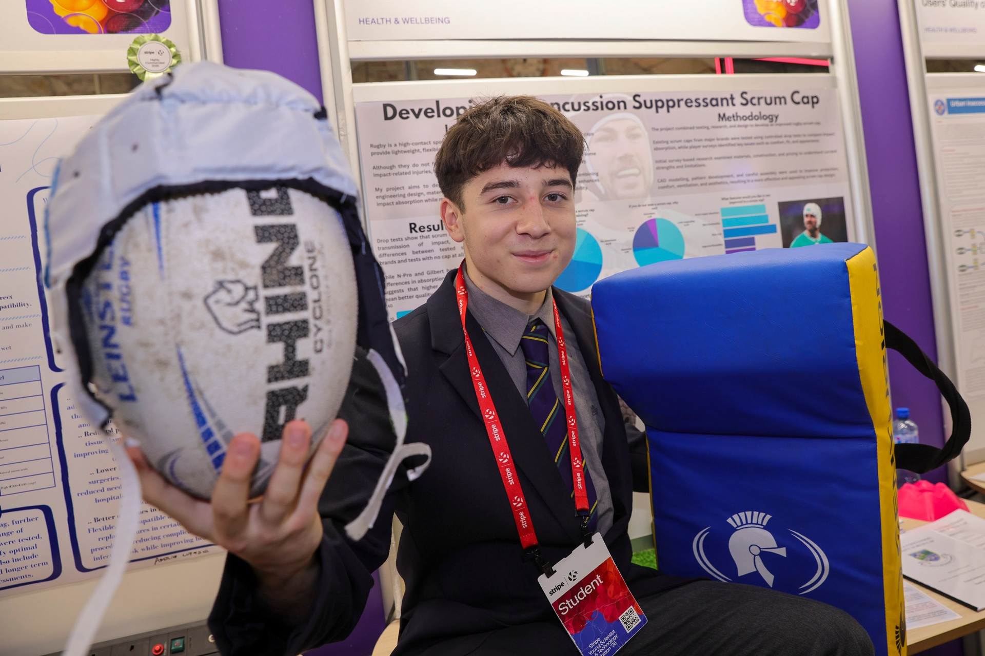 Pictured is student Evan McCormack from St Paul's Secondary School in Monasterevin, Kildare, with his project, 'Developing a Concussion Suppressant Scrum Cap', at the 2026 Stripe Young Scientist and Technology Exhibition.