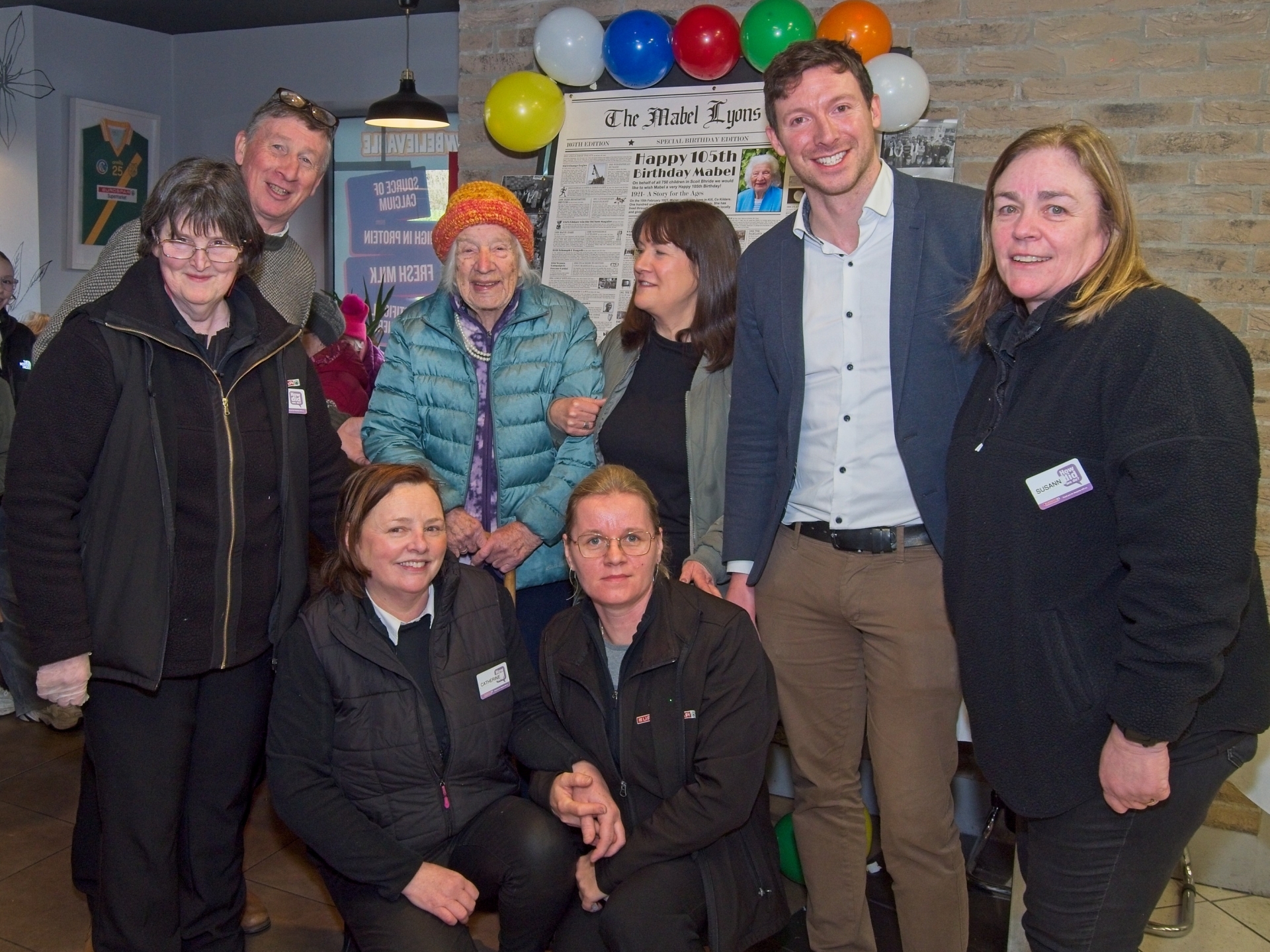Birthday girl, Mable Lyons from Kill, on her 105th birthday, pictured with management and staff members of Eurospar, Kill, Nuala Boylan, Jimmy Carolan, Mabel with her carer Laura Molloy, Chris Furey, Susanne O’Leary and (front kneeling) Catherine McGarr and Barbera Kaja, at the birthday party reception in her honour at the shop on Tuesday 17th February.