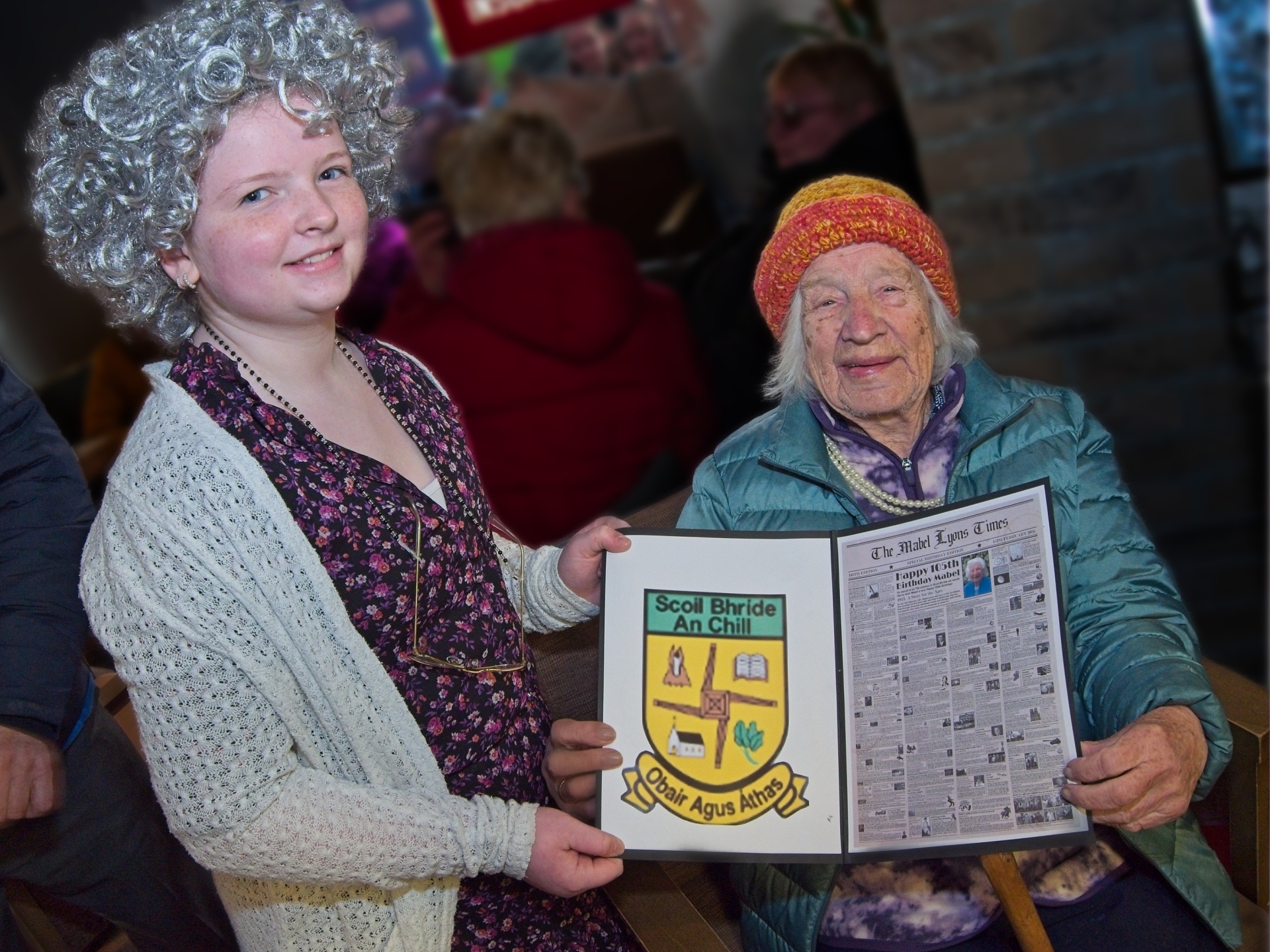 Birthday girl, Mable Lyons from Kill, receives a presentation of a specially made birthday card by the pupils of Scoil Bhride NS, Kill Village, with 6th class pupil Olivia presenting to Mabel at a special 105th Birthday reception in her honour in the village on Tuesday 17th February.